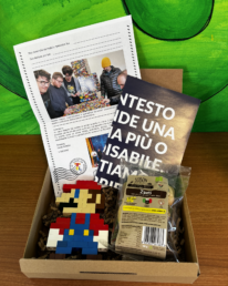 Scatola con 1 biscotti “Zaeti” realizzati da un forno BIO da ragazzi con disabilità + 1 Super Mario fatto di lego + lettera dei Talents + opuscolo della cooperativa